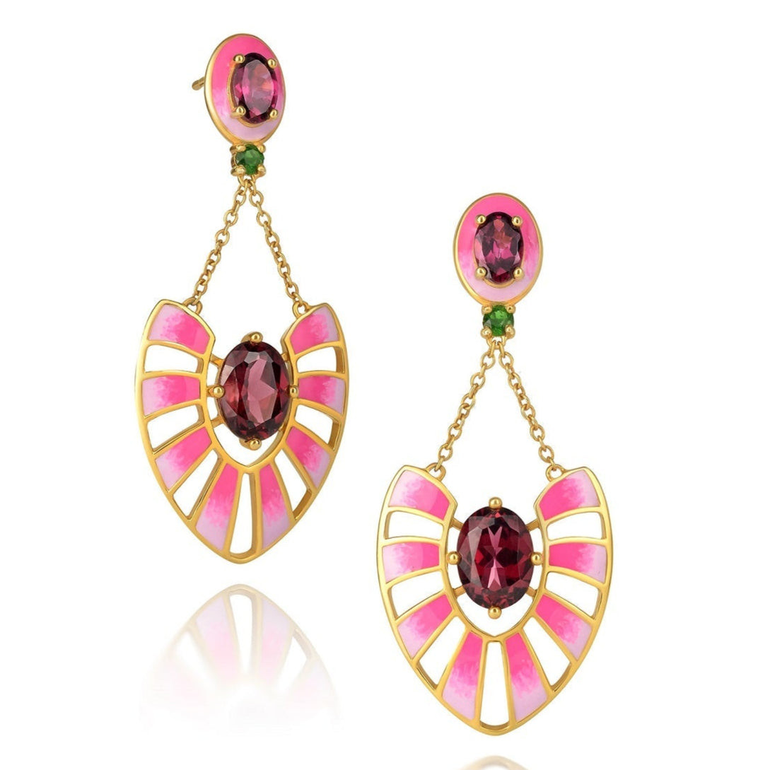 Martha Seely Designs Sterling Silver Gold Plated Hand Painted Enamel & Rhodolite Garnet Dangle Earrings