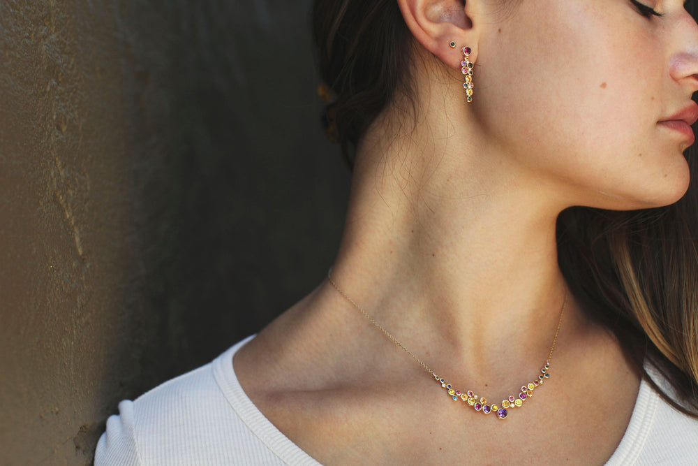 Add a unique elegance to your look with these luxurious Martha Seely Designs dangle earrings. Hand-crafted in sterling silver gold plate and painted with bright enamel, these earrings feature four brilliant London Blue Topaz stones and two shimmering Chrome Diopside stones for a truly captivating look. The perfect statement piece for any occasion.