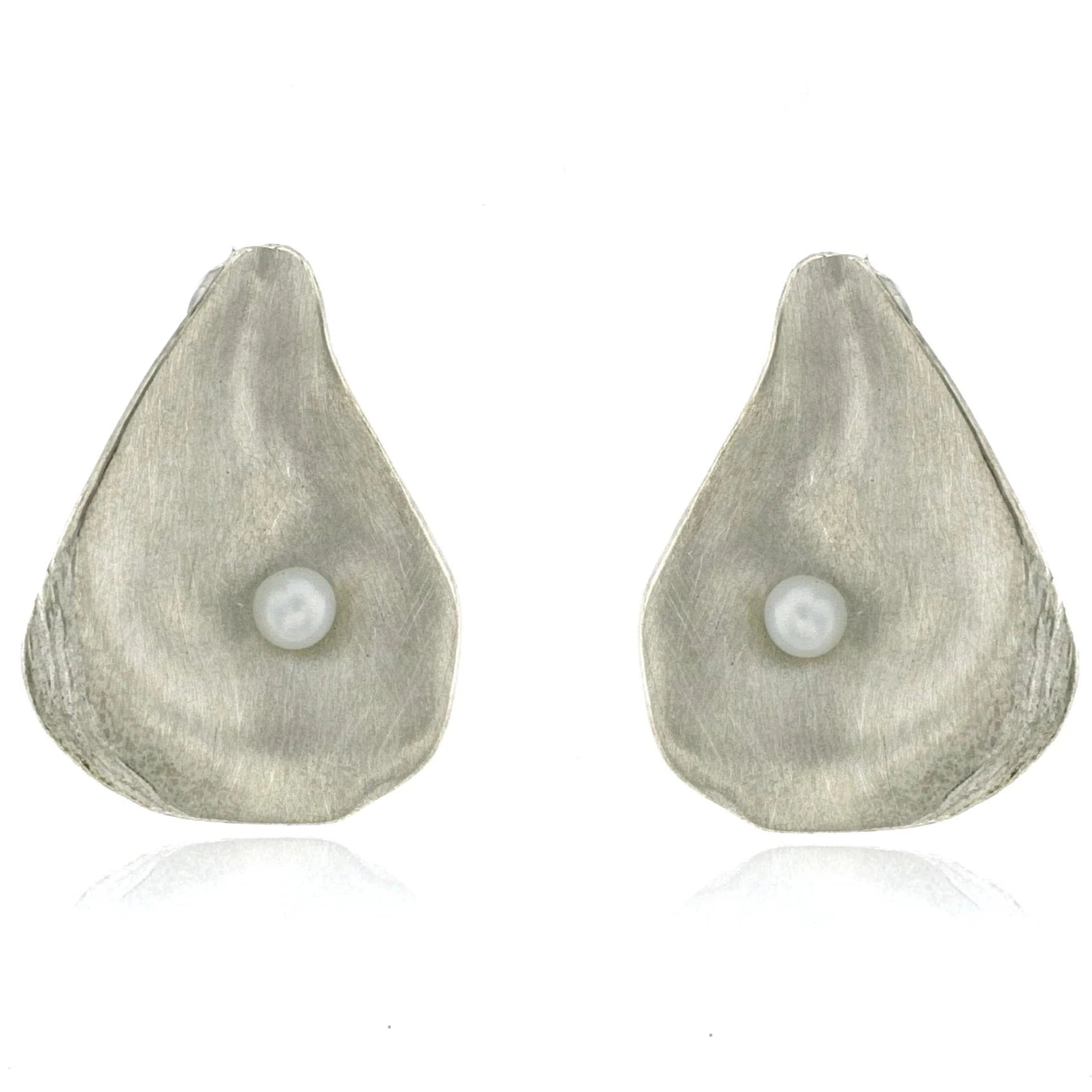Mysterium Collection Satin Finish Sterling Silver Oyster Shell Freshwater Pearl Earrings