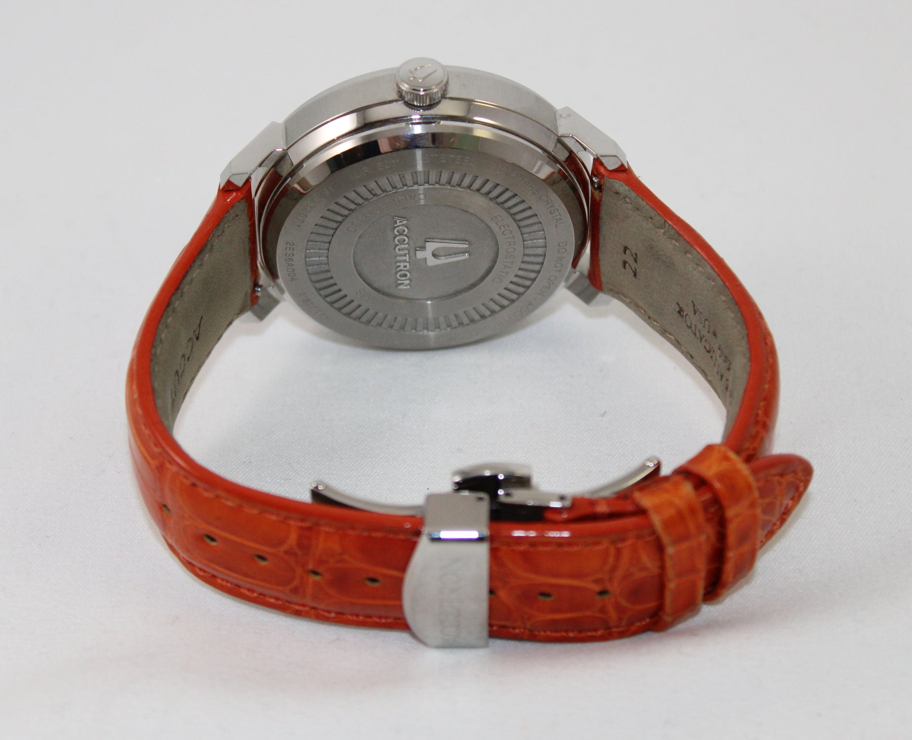 • Strap:  Orange American Alligator strap with deployment buckle, 22mm