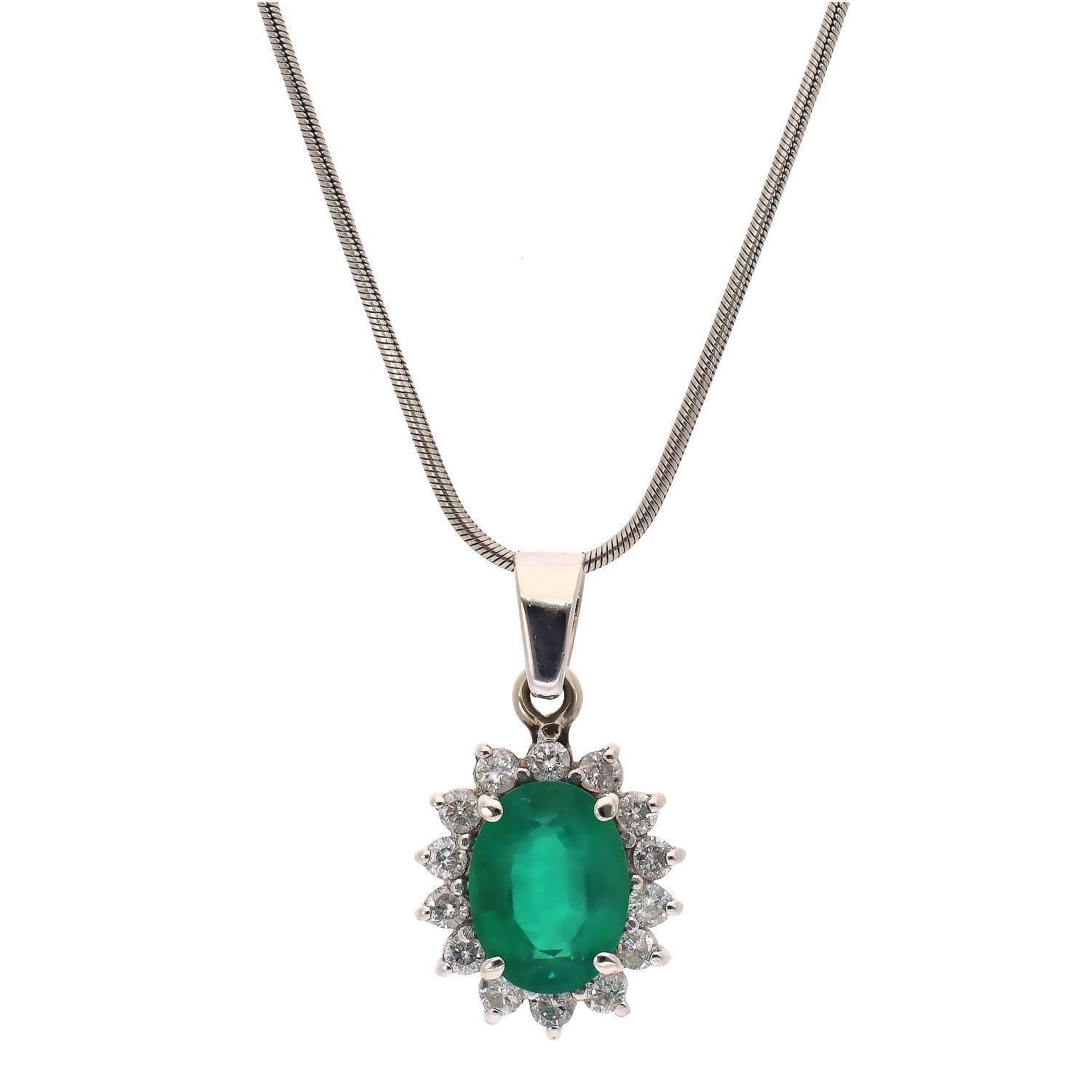 14K White Gold Oval Emerald with Diamond Halo 18 Inch Necklace