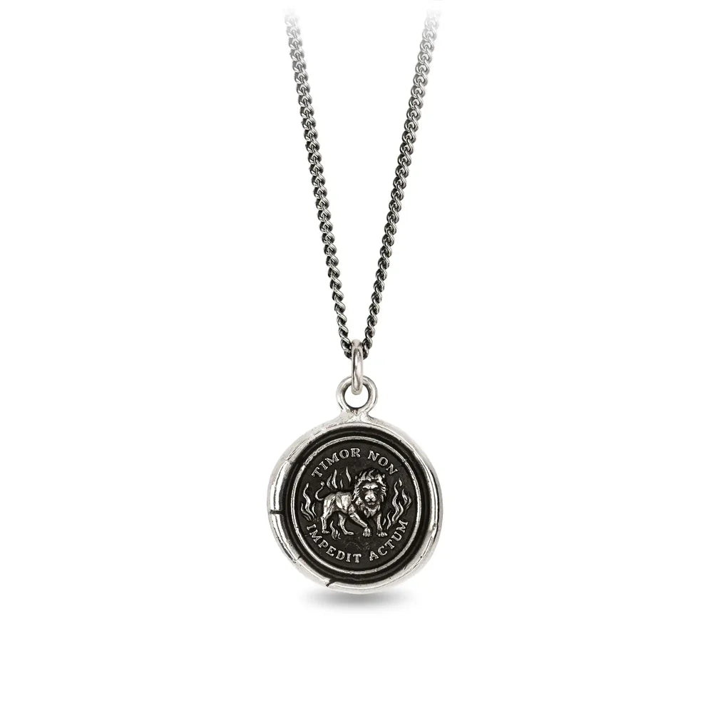 This talisman symbolizes the strength required to act in spite of fear. The lion walking through fire and the Latin phrase Timor Non Impedit Actum—“Fear does not prevent action”—represent courage born from facing what frightens us.