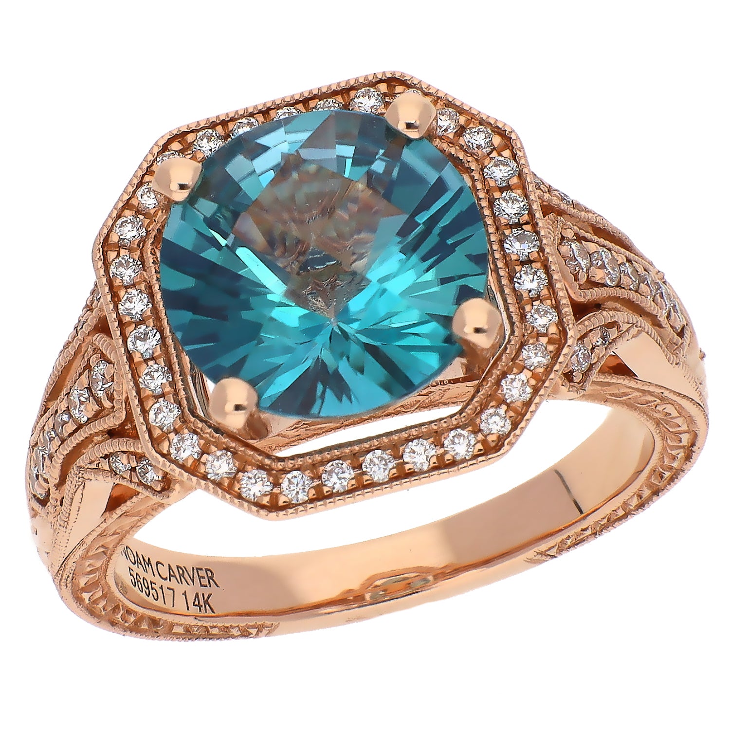 Indulge in luxury with this custom 14K Rose Gold Blue Zircon and Diamond Ring. Crafted with exquisite detail, this ring features a stunning blue zircon gemstone and sparkling diamonds set in a warm rose gold band. Elevate your style and make a statement with this alluring piece.  Zircons are natural gemstones, not to be confused with cubic zirconias.