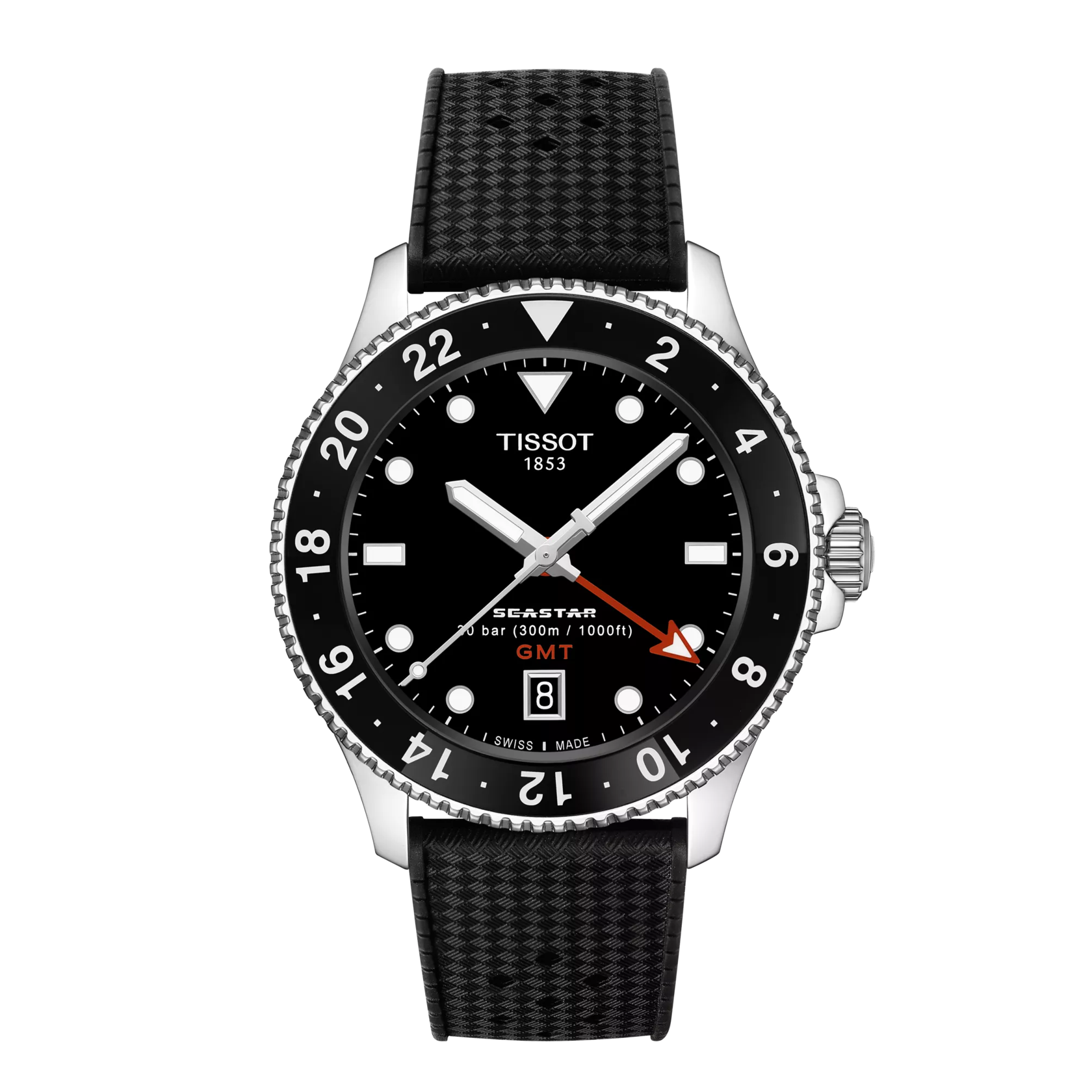 Strap: Black tropic-style rubber strap with signed Tissot stainless-steel buckle.