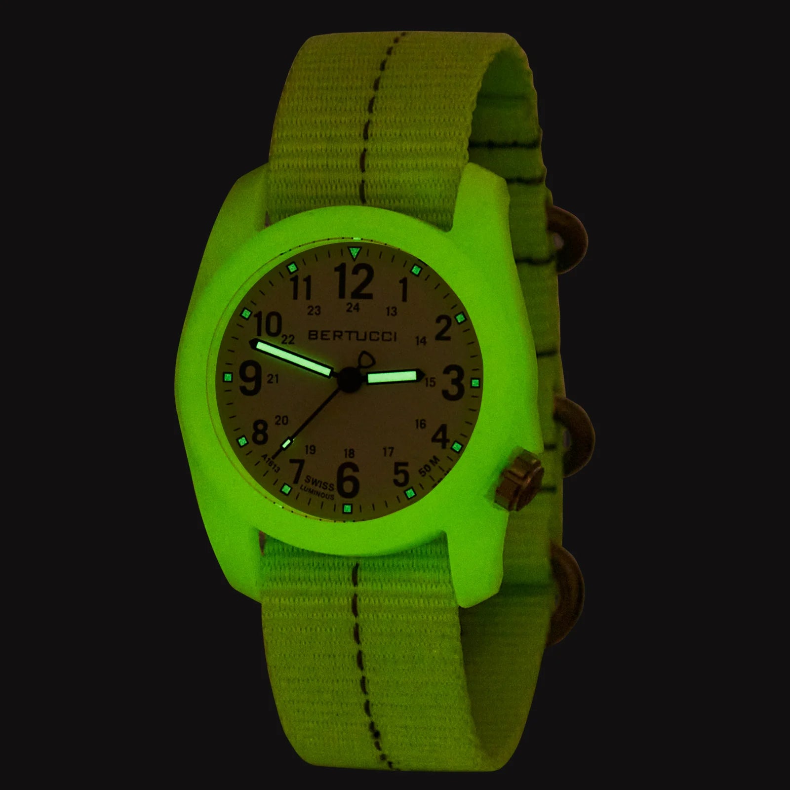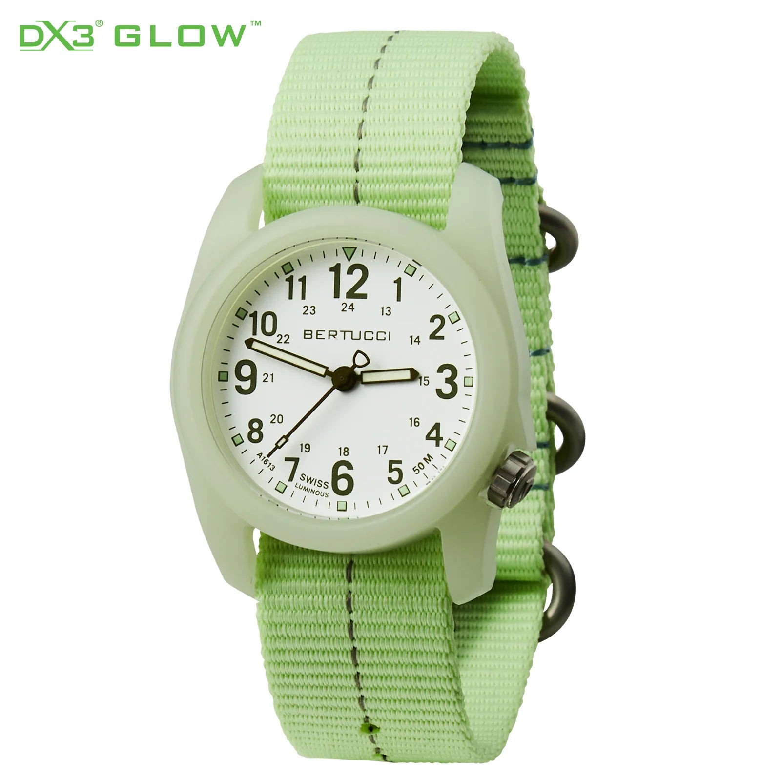 The DX3 Glow Series features Bertucci's legendary U.S. Patented A-2 Unibody 40 mm case in a special luminous resin material. The watch case will emit a continuous glow for hours based on the level of light exposure. This is beneficial for low light activities for visibility, locating and reading the watch. Additionally, packed with performance features such as precise and reliable all-metal movement, 4-year battery life, 50 M water resistance, U.S. Patented Active-Comfort B-Type Dash Line nylon band, Swiss super luminous hands and markers, solid stainless-steel crown, case back and band hardware, and scratch resistant R-Type mineral glass crystal.